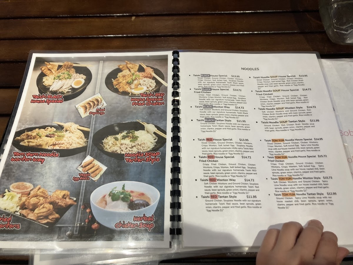 Soft Chicken Wontons and Ground Chicken. Soupless Noodle with our signature homemade Taishi Black sauce, bean sprouts, green onion, cilantro, pepper and fried garlic. Rice noodle or “Egg Noodle $1”